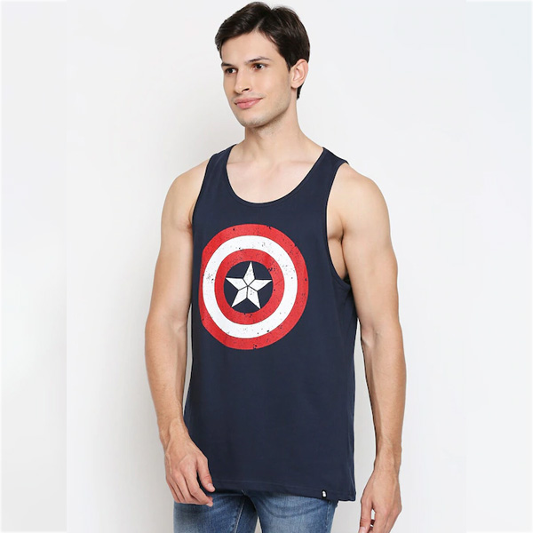 • Navy blue, red and white captain america logo printed tank innerwear vests, has a scoop neck, sleeveless