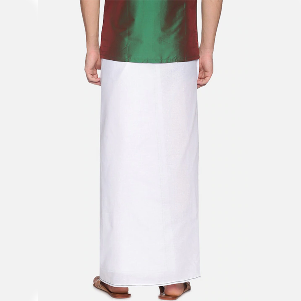 White solid mid-rise dhoti with red border, secured with a velcro closure, has 2 pockets
