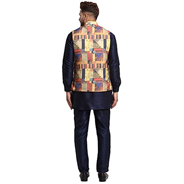 Style: Kurta Pyjama with Nehru jacket Jacket.We offer Five sizes - Small = 36 (Chest - 40), Medium = 38 (Chest - 42), Large = 40 (Chest - 44), X- Large = 42 (Chest - 47), XX - Large = 44 (Chest - 49).